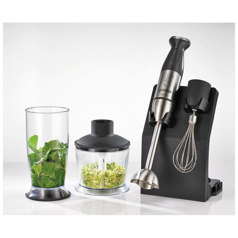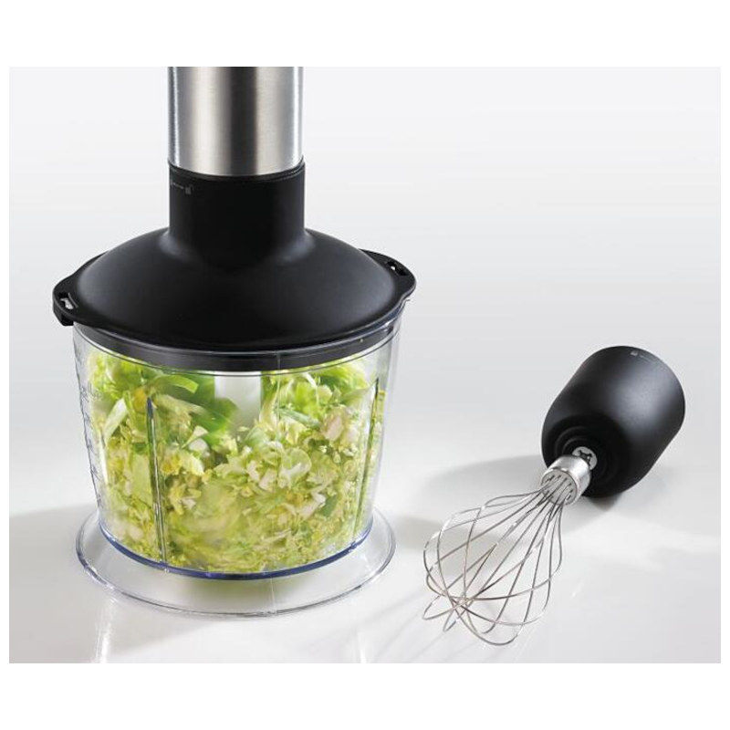 - Nastavci štapnog miksera: Metalna noga za sjeckanje, Posuda za miješanje sa stalkom, Metlica za tučenje, Sjeckalica s posudom, Stalak