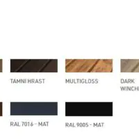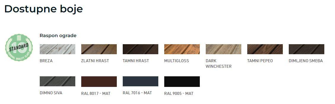 - Dostupne boje na skladištu: crna (RAL 9005), siva antracit (RAL 7016), dekor drva TAMNI HRAST, dekor drva svijetli WINCHESTER